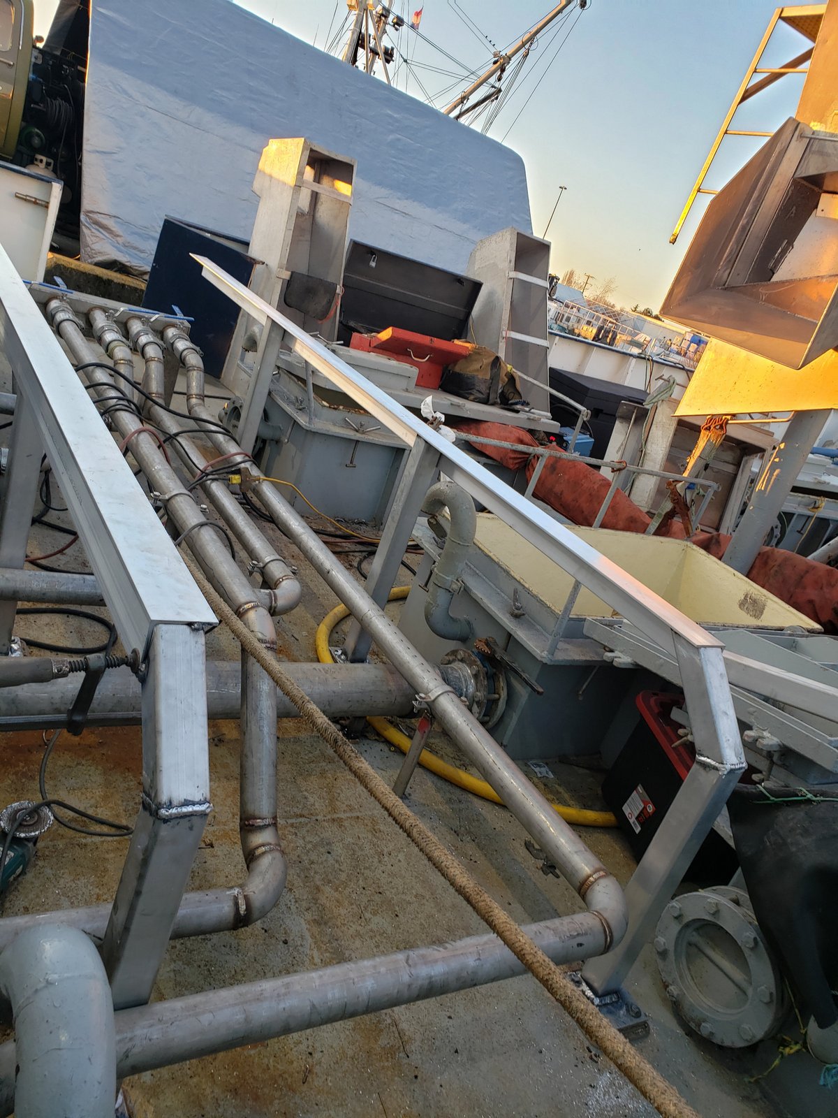 conveyer transfer systems, fish dewatering and sorting chutes, conveyors, self leveling
